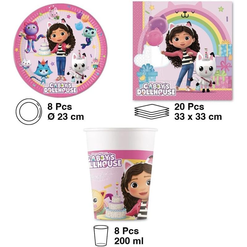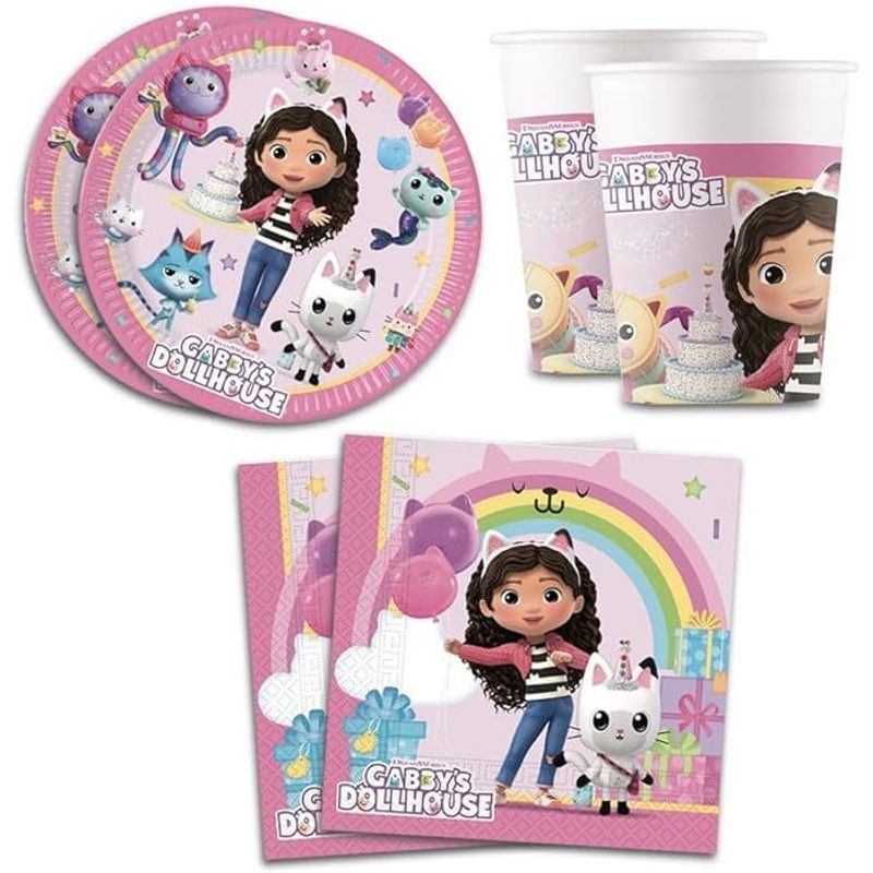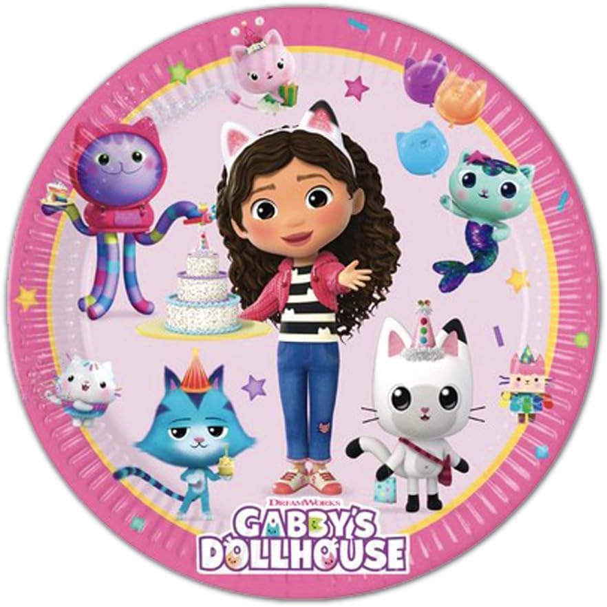 Kit Party per 8 Persone Decorazione da Tavola per Festa di Compleanno con 8 Piatti, 8 Tazze e Tovaglioli GABBY ? Set compleanno ideale per 8 persone comprende 8 piatti 23 cm, 8 tazze, 16 tovaglioli ? Articoli con licenza ufficiale Tutti i materiali utilizzati sono di qualità alimentare e non -tossico. ? Rendi più accattivanti le feste di compleanno a tema con le decorazioni. ? Usalo per la tua festa e festa a tema!