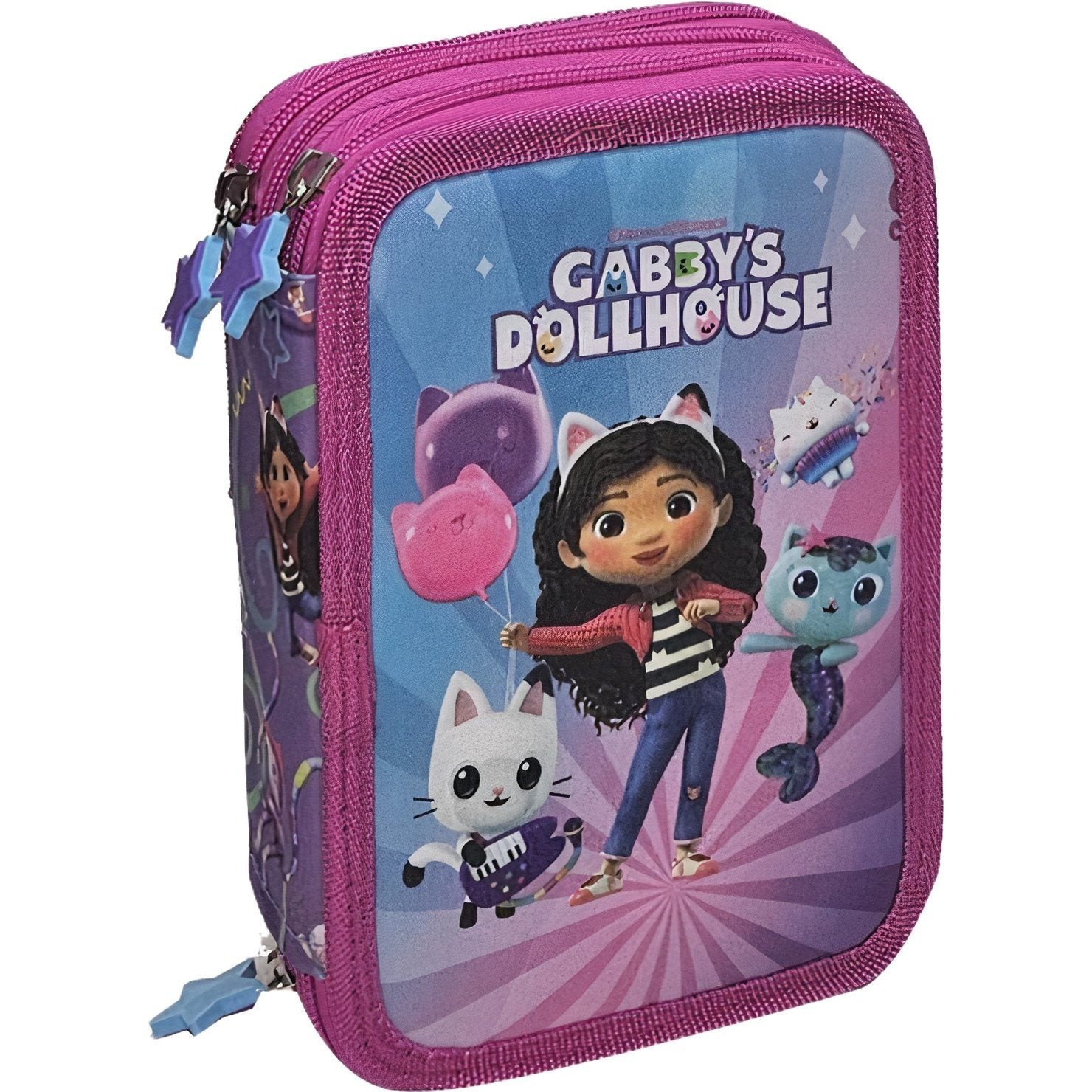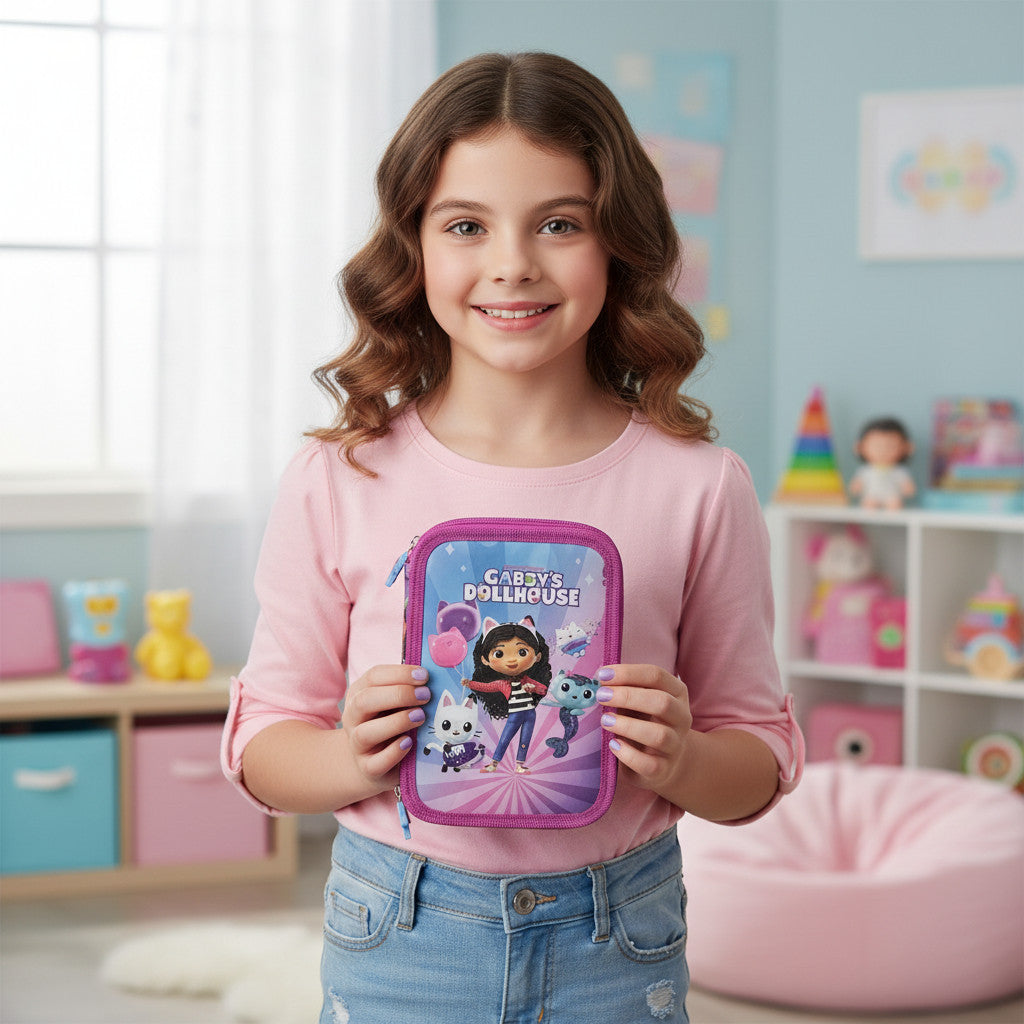 Questo astuccio a 3 scomparti "Gabby's Dollhouse" con contenuto è perfetto per i giovani fan della popolare serie per bambini! È dotato di tre ampi scomparti con cerniera ed è pieno di vari articoli scolastici: ideale per la scuola, la casa o in viaggio. Grazie al suo design robusto e alla colorata stampa di Gabby, non è solo pratico, ma anche super divertente da portare con sé.
